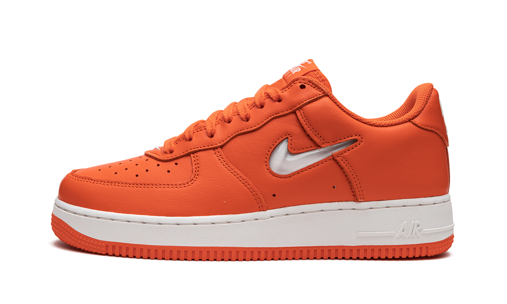 The Nike Air Force 1 Low Jewel “Orange” is a head-turning colorway of the classic basketball and lifestyle shoe with a mostly monochromatic orange design. This version of the legendary Air Force 1 features an orange leather build with a contrasting Jeweled Swoosh on the sides. Throwback “Nike Air” branding is embroidered on the heel and “Air Force 1” detailing is printed on the tongue tag. A small white Swoosh is stitched onto the vamp. Underfoot, the shoe rides on a white rubber midsole with “Air” branding on the lateral side. An orange outsole completes the look. 40th Anniversary Edition Orange Jewel
